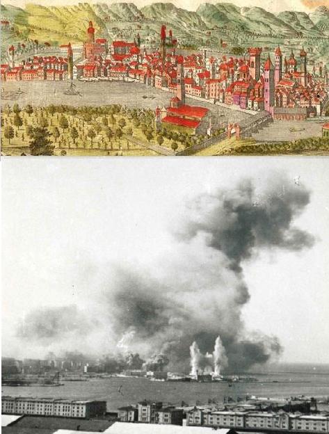 | Above: Ancient Trent and modern Trent during the first allied bombing over the city on April 2, 1944. From historic bomb mapping missions carried out by the US in the area, Trent is unique in that it is known that 32,019 of the high explosive Allied bombs (801 with long delay fuses) aimed to attack 271 targets are still missing and unaccounted for, laying in wait to maim and kill people. |