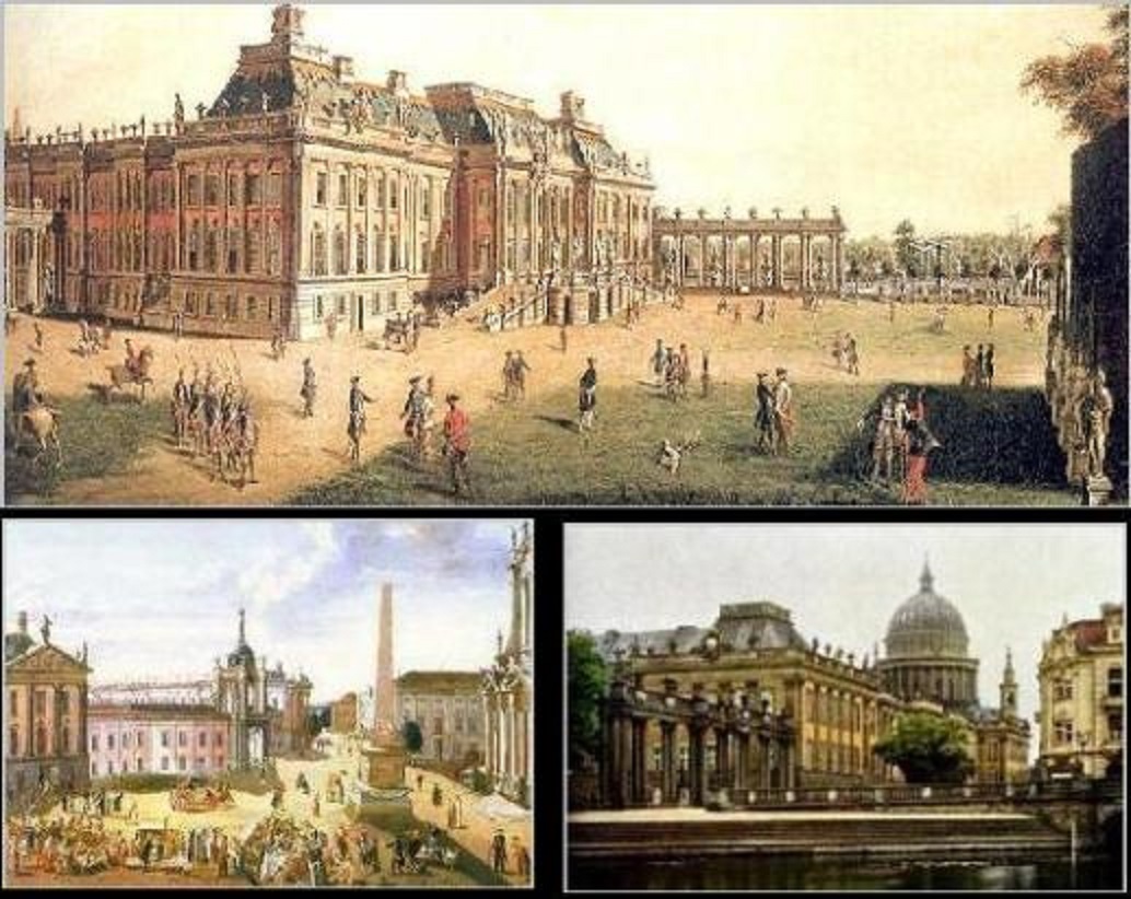 | During an allied bombing attack on April 14, 1945 Potsdam Palace was bombed and burned out, but some parts of the main walls remained. The occupying communists in Germany in 1959/1960 decided to remove the ruin in 1960. The formerly cohesive New Market lost its face. The only building of the castle that was left standing was the stables. |