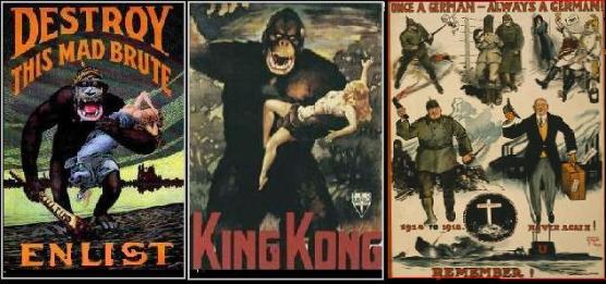 A lasting result from this war was that the image of Germans was forever changed. Years after the fact, even when the Bryce Report and other German atrocity stories were proven to be utter fabrications, it did little to stop them from being recirculated later. The Bryce Report is still cited as a credible reference! And while even Nancy Drew books have been cleansed of rather innocent "racial stereotypes" and republished in new, more politically correct form, schools, libraries and internet auctions still have plenty of moldy, archaic CPI and WPB sponsored books propped on their shelves which ridicule or fuel fear and hatred of Germans. The Hun even emerged over a decade after war's end in the form of King Kong, helmetless but subliminally intact. Did this racial stereotyping disappear in modern times? Former Tory prime minister Margaret Thatcher had concluded that the "German character" was marked by "aggressiveness, bullying, assertiveness, egotism, excessive exaggerations, inferiority complex, self pity, sentimentality" according to a minute drawn up by aide Charles Powell of a seminar at Chequers in 1990. The previous summer, Thatcher begged Poland's Soviet-backed military dictator General Jaruzelski: 'We cannot allow German reunification, and you have to protest against it very loudly!' |