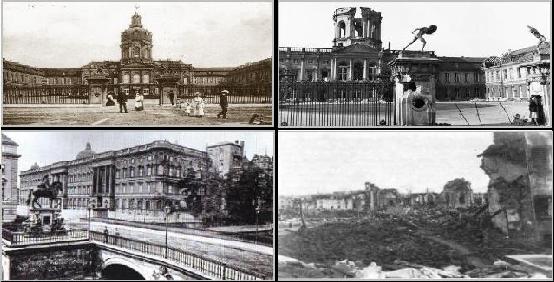 | Another palace blown up after the war was the Berlin Schlossplatz, the Hohenzollern royal palace and winter home to the Prussian Electors, Kings and Kaisers. It was the center of Berlin for centuries, and the architecture of the entire inner city had been conceived around the central palace. Originally a medieval castle dating back to the fifteenth century, over the ages it became a grand residence, expanded and rebuilt in differing architectural styles by various masters. Shortly after Germany lost the First World War and Kaiser Wilhelm II abdicated, the Palace became a museum. |