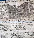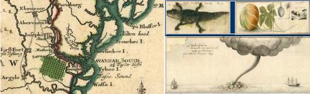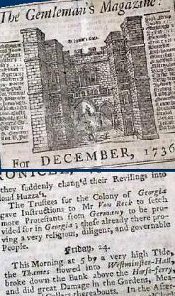 | Above (click), the London Merchant sails for America in 1738, some of Von Reck's sketches, a map of area of New Ebenezer on the Savannah River, prepared for Samuel Urlsperger and published by Matthaeus Seutter in 1747. A period London newspaper on the right makes mention of the Salzburgers: "The trustees for the colony of Georgia gave instructions to Mr Von Reck to fetch more Protestants from Germany to be provided for in Georgia; those already there proving a very religious, diligent, and governable people". Back in London, the emigration was of interest and updates would be printed in the London media. |