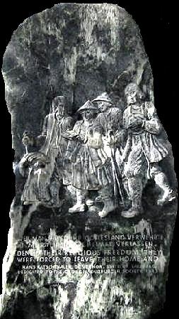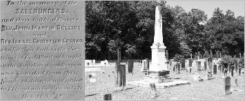 | In 1984, Albert Winter of Salzburg, Austria visited Ebenezer for the 250th anniversary of the landing, and upon his return home, he requested that Austrian officials donate a monument to the Georgia Salzburgers. Anton Thuswaldner was commissioned to sculpt the monument of stone cut from the Austrian mountains and it was brought to Savannah and dedicated in 1994. In June, 1996, a half acre area around the monument was named Salzburger Park. Monument, left (click) |