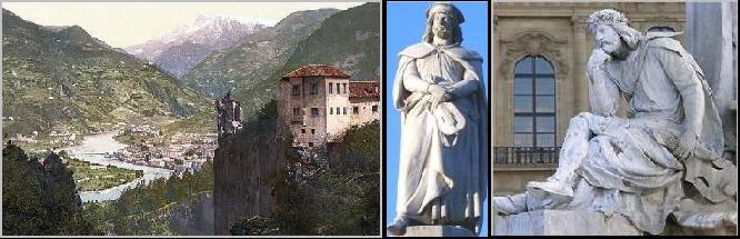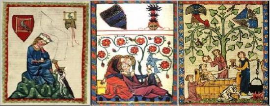 | The Manesse Codex or Große Heidelberger Liederhandschrift is an illuminated manuscript in codex form copied and illustrated with 137 miniatures between 1305-1340 in Zürich, compiled at the request of the patriarchal Manesse family of Zürich. It contains the texts of love songs in Middle High German by important poets, several of whom were famous rulers. The term for these poets, Minnesänger, combines the words for "romantic love" and "singer", reflecting the poetry's content, which adapted troubadour tradition to Germany. The entries are approximately ordered by the social status of the poets, starting with the Holy Roman Emperor Heinrich VI down through various dukes, counts and knights to commoners. After the Thirty Years War and the conquest of Heidelberg, the collection ended up for decades in the library of the French scholar Jacques Dupuy who willed it to the king of France. Since 1657, it was in the possession of the royal library in Paris until it found its way home to Heidelberg in 1888, where it is now kept. One picture is of Herr Walther von der Vogelweide. Walther von der Vogelweide, c. 1170-c.1230, was the most famous German medieval lyric poet. From his name, it is assumed that he was of noble birth and some believe that he was from Tirol, home to several noted Minnesingers of his time, although a farmhouse is mentioned 1556 as “Vogelweidhof” and may have been in Lower Austria's Waldviertel. An ancient map shows a village and a field marked “Vogelwaidt” with a related house of a village long deserted, and scholars found evidence of the Christian name Walther in that region. In any case, the young poet probably learned his craft under an old master and spent a happy part of his life in the hills. From there, he wandered from court to court, singing for his lodging and his food, ever hoping to be saved from poverty by an admiring patron. For a time, the enlightened Duke Friedrich I. of the house of Babenberg answered Walther's prayers. The Duke had turned Vienna into a center of poetry and art and Vogelweide studied here under the master Reinmar the Old. In Vienna, he produced spontaneous and passionate love-lyrics, but when the Duke died in 1198, Walther again became an itinerant musician, wandering from court to court singing for his food and lodging. An opinionated man, Walther was forced to leave several court jobs. He spent time under Duke Bernhard of Carinthia, the landgrave of Thuringia, and Dietrich I of Meissen where he complained that he had received neither money nor praise for his services. When Emperor Henry VI 's death initiated a struggle between empire and papacy, Walther stood firmly on the side of German unity and independence, and even though he was an ardent Catholic, he was steadfastly opposed to the pope's extremism. When, in 1212, Friedrich II. became the sole representative of German royalty against pope, Walther's enthusiasm for the empire was rewarded with a small fief in Franconia. This provided him with a home, but he did not stay long before moving again to Vienna. In or around 1224, after his stay in Vienna, he seems to have settled on his fief where he was active in urging the German princes to take part in the crusade of 1228, and may have even gone as far as Tirol with the crusading army. He died around 1230 at his fief. It is said that he had left wishes that upon his death birds were to be fed daily at his tomb. The original gravestone with its Latin inscription has long since disappeared; but in 1843 a new monument was erected over the spot. There is also a statue of the poet at Bozen (Bolzano in Italian), a small city located in the valley of the Etsch, which is the capital of South Tyrol, a mountainous Austrian region now belonging to northern Italy, where the majority of the population consists of German- speaking ethnic Austrians. |