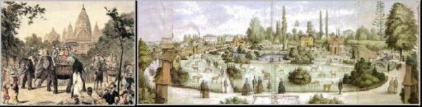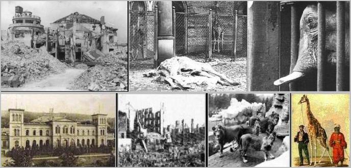 | Above: Elephant house Berlin Zoo 1844; Old Frankfurt Zoo. Below, top row: Berlin Zoo 1945. Bottom: Wuppertal Zoo; Frankfurt Zoo bombed; Starving cats; The first giraffe in Vienna |